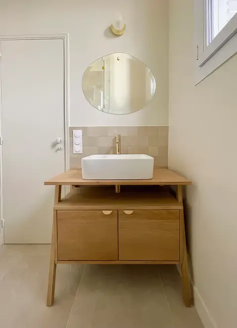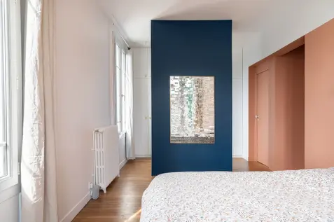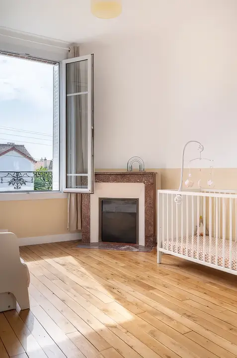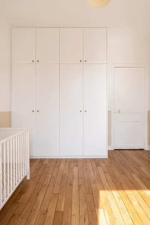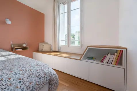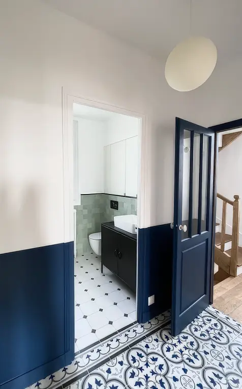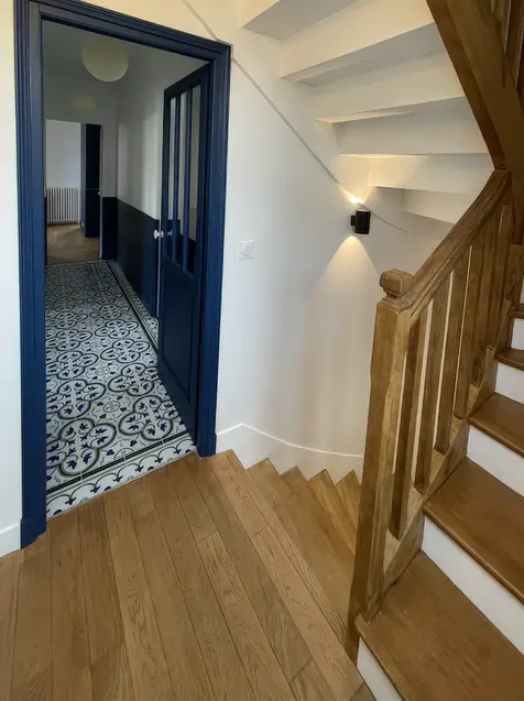L'enjeu de ce projet fut de réunifier les deux étages d'une maison divisés en deux appartements, afin de retrouver la distribution initiale de la maison entre pièces à vivre en rez-de-chaussée et espaces nuit à l'étage, tout en optimisant la distribution des chambres pour répondre au cahier des charges des clients. L'étage accueille à présent deux chambres enfants, une salle de bain commune, et une chambre parentale avec dressing et salle de bain. Différentes palettes de couleurs se révèlent à travers l'ensemble de la maison, jouant sur les contrastes, et évoquant par petites touches le style de la meulière d'origine.